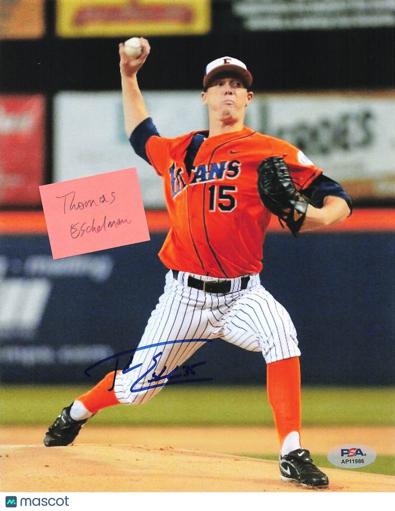 Up for sale is a 8x10 Photo hand signed by Thomas Eshelman of the Cal State Fullerton Titans. This autographed photo is professionally authenticated by PSA, ensuring authenticity for collectors and fans alike. A great addition to any sports memorabilia collection. Listed With Mascot.
