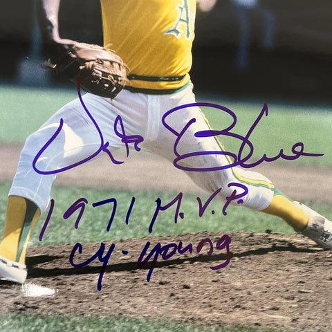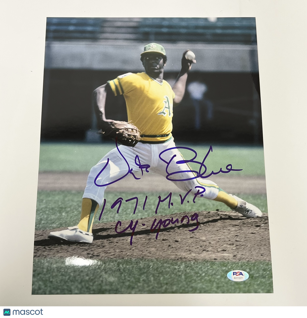 Up for sale is an 11x14 Photo signed by Vida Blue of the Oakland Athletics. The inscriptions on the photo include "1971 MVP" "Cy Young" The autograph of Vida Blue on this photo was authenticated by a team of experts at so you can rest assured you are purchasing the real deal. Listed With Mascot.