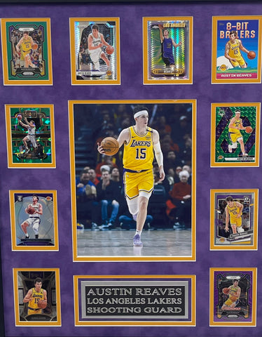 Bring home a stunning tribute to one of the NBA's premier talents with this custom Austin Reaves display. Professionally designed and framed, this piece features a vibrant 8x10 action photo of Austin Reaves surrounded by a curated selection of trading cards (cards will vary), all mounted on premium team-colored matting with striking accents.