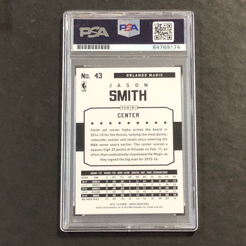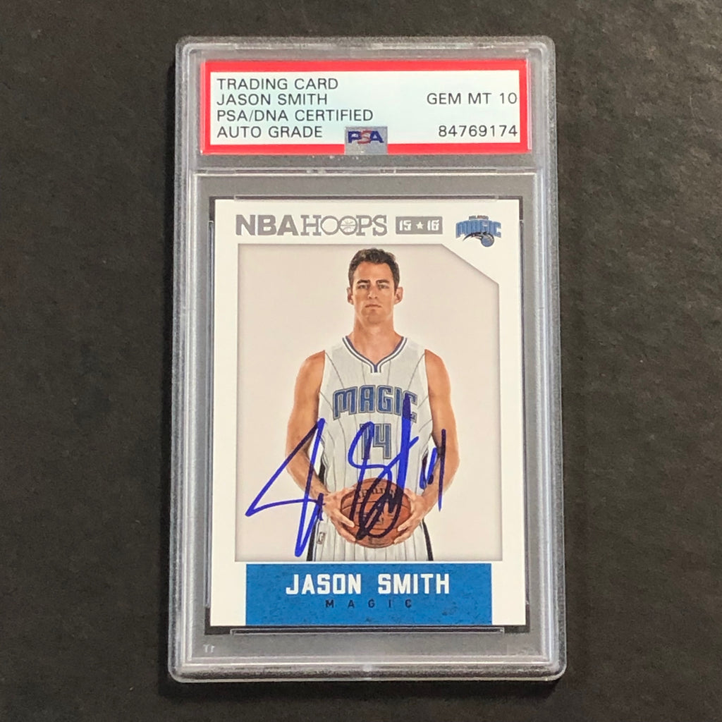 Up for sale is a 2015-16 NBA Hoops #43 card signed by Jason Smith who notably played for the Orlando Magic. The autograph of Jason on this card was authenticated by a team of experts at PSA/DNA Authentication Services (PSA/DNA) and encapsulated so you can rest assured you are purchasing the real deal.