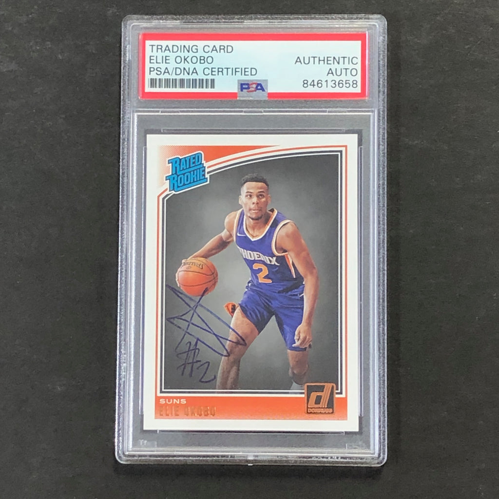 Up for sale is a 2018 Donruss Rated Rookie #159 rookie card signed by Elie Okobo who notably played for the Phoenix Suns. The autograph of Elie on this card was authenticated by a team of experts at PSA/DNA Authentication Services (PSA/DNA) and encapsulated so you can rest assured you are purchasing the real deal.