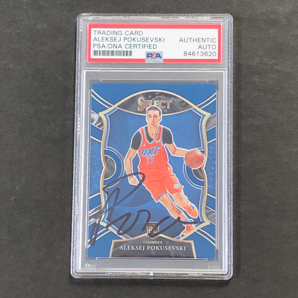 Up for sale is a 2020-21 Panini Select #77 card signed by Aleksej Pokusevski. The autograph of Aleksej on this card was authenticated by a team of experts at PSA/DNA Authentication Services (PSA/DNA) and encapsulated so you can rest assured you are purchasing the real deal.