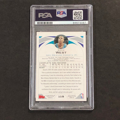 Up for sale is a 2004-05 Topps Basketball #119 signed by David West who notably played for the New Orleans Hornets. The autograph of David on this card was authenticated by a team of experts at PSA/DNA Authentication Services (PSA/DNA) and encapsulated so you can rest assured you are purchasing the real deal.