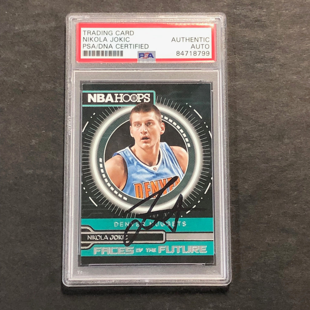 Up for sale is a 2016-17 NBA Hoops Faces of the Future #12 card signed by Nikola Jokic of the Denver Nuggets. The autograph of the Joker on this card was authenticated by a team of experts at PSA/DNA Authentication Services (PSA/DNA) and encapsulated so you can rest assured you are purchasing the real deal.