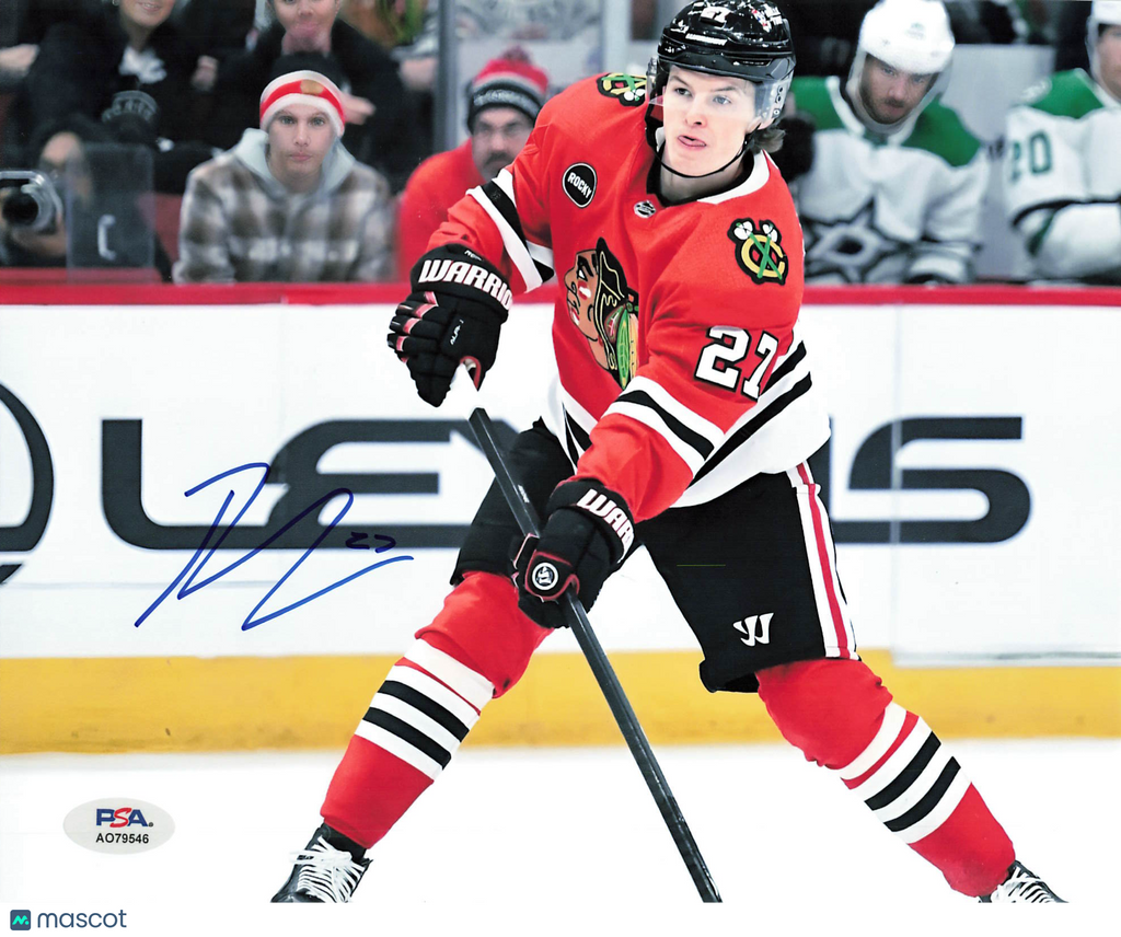 Up for sale is a signed hockey 8x10 Photo autographed by Lukas Reichel. The autograph has been professionally authenticated by PSA, providing confidence in the authenticity of this hockey memorabilia. A great addition to any hockey or sports memorabilia collection. Listed With Mascot.