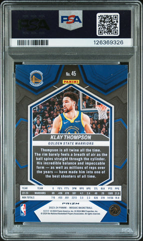 Thank you for checking out our store! We value each and every customer and want you to be happy with the purchase you are making. You are purchasing a 2023 Panini Mosaic #45 Klay Thompson PSA A Auto A . We’d like to encourage you, our customer, to reach out to us if you come across any questions. We always take the time to respond to a message from our customers and we’re happy to hear from you! Listed With Mascot.