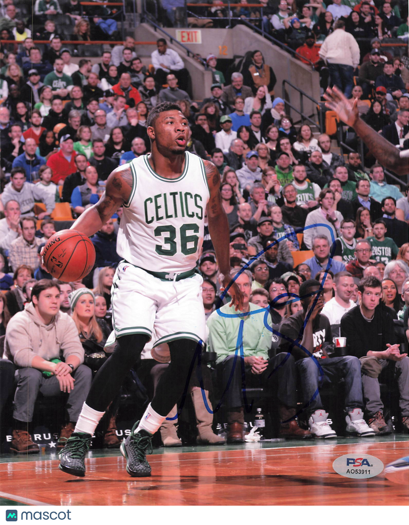 Up for sale is a signed basketball 8x10 Photo autographed by Marcus Smart of the Boston Celtics. The autograph has been professionally authenticated by PSA, providing confidence in the authenticity of this basketball collectible. A great addition to any basketball or sports memorabilia collection. Listed With Mascot.