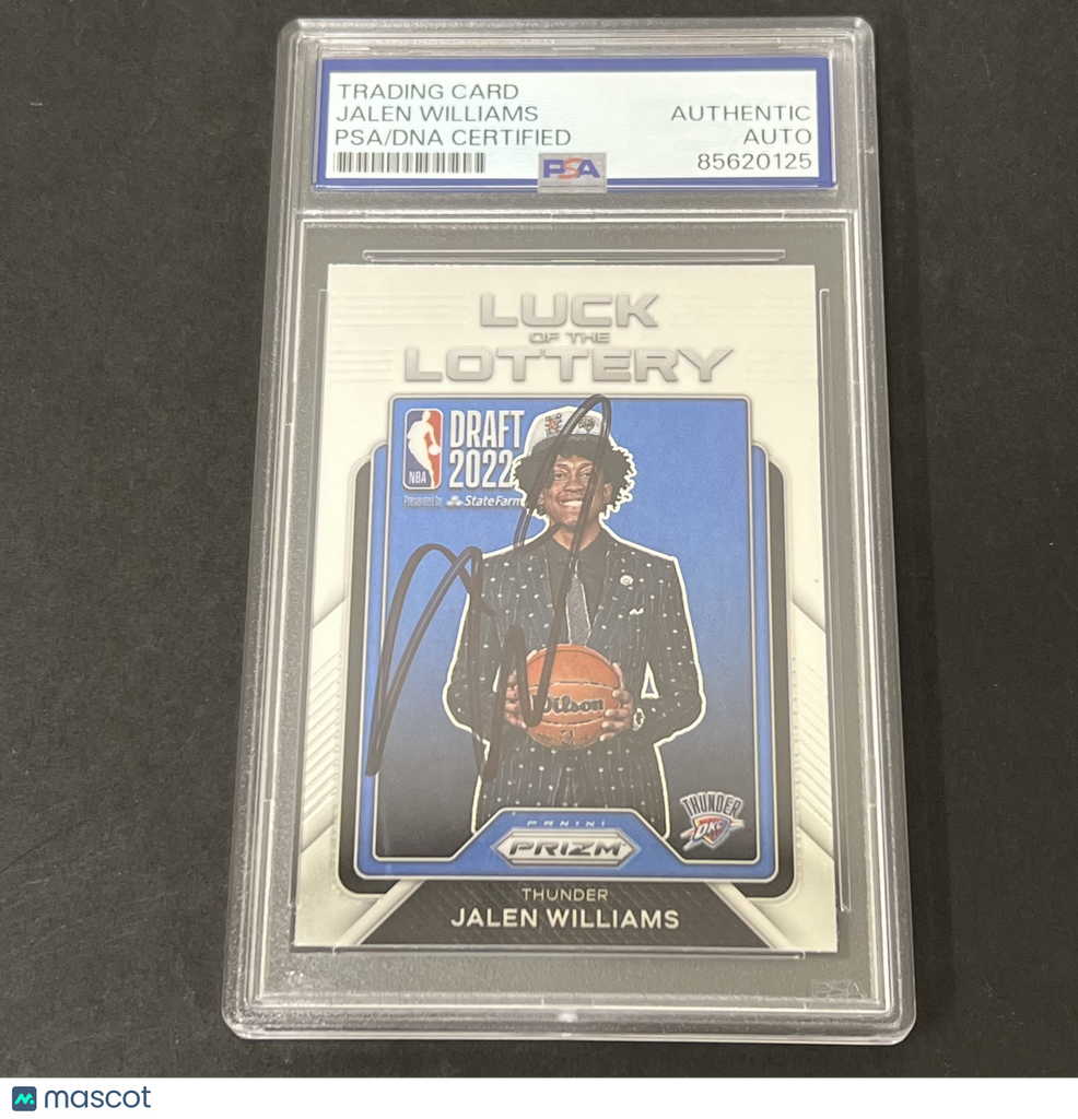 Thank you for checking out our store! We value each and every customer and want you to be happy with the purchase you are making. You are purchasing a 2022-23 Panini Prizm #1 Jalen Williams PSA . We’d like to encourage you, our customer, to reach out to us if you come across any questions. We always take the time to respond to a message from our customers and we’re happy to hear from you! Listed With Mascot.