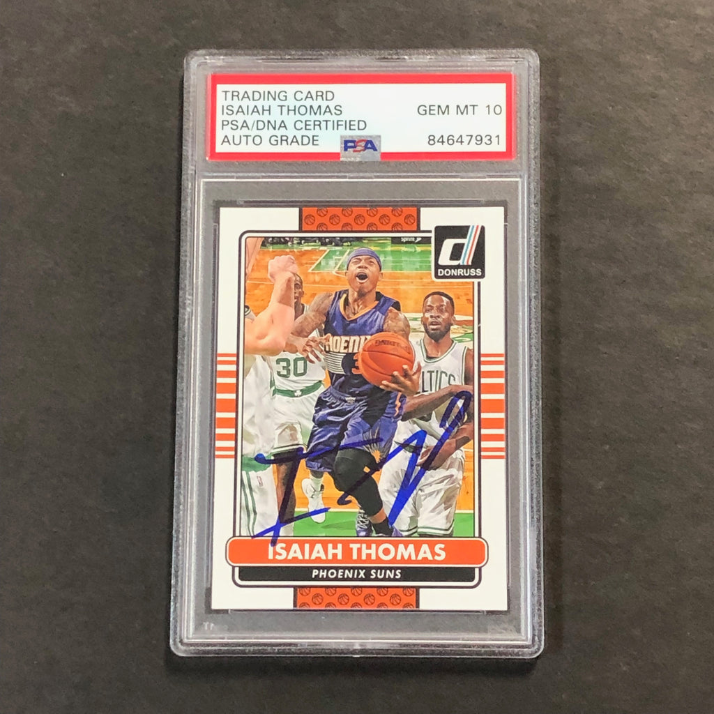 Up for sale is a 2014-15 Panini Donruss #84 card signed by Isaiah Thomas who notably played for the Phoenix Suns. The autograph of Isaiah on this card was authenticated by a team of experts at PSA/DNA Authentication Services (PSA/DNA) and encapsulated so you can rest assured you are purchasing the real deal.