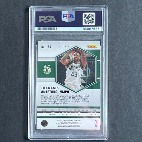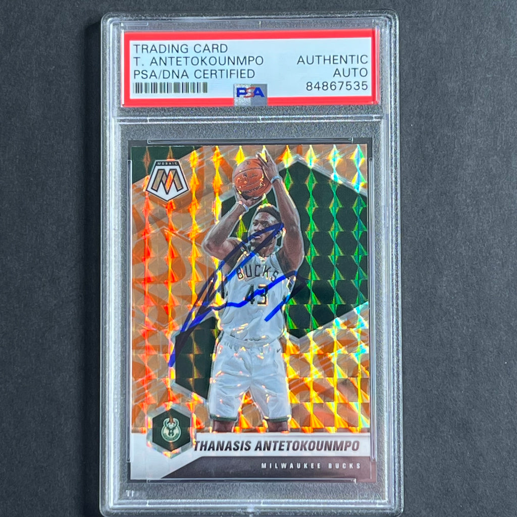 Up for sale is a 2020-21 Panini Mosaic #167 card signed by Thanasis Antetokounmpo. The autograph of Thanasis on this card was authenticated by a team of experts at PSA/DNA Authentication Services (PSA/DNA) and encapsulated so you can rest assured you are purchasing the real deal.