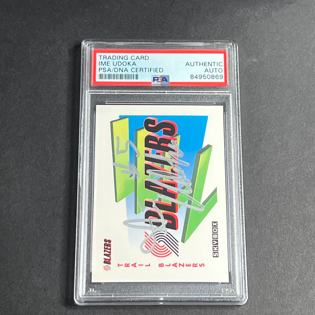 Up for sale is a 1992 Skybox #372 card signed by Ime Udoka who notably played for the Portland Trail Blazers . The autograph of Ime on this card was authenticated by a team of experts at PSA/DNA Authentication Services (PSA/DNA) and encapsulated so you can rest assured you are purchasing the real deal.