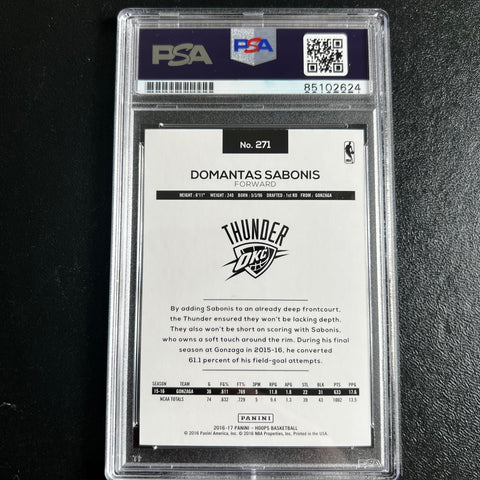 Up for sale is a 2016-17 NBA HOOPS #271 card signed by Domantas Sabonis who notably played for the Oklahoma City Thunder. The autograph of Domantas on this card was authenticated by a team of experts at PSA/DNA Authentication Services (PSA/DNA) and encapsulated so you can rest assured you are purchasing the real deal.