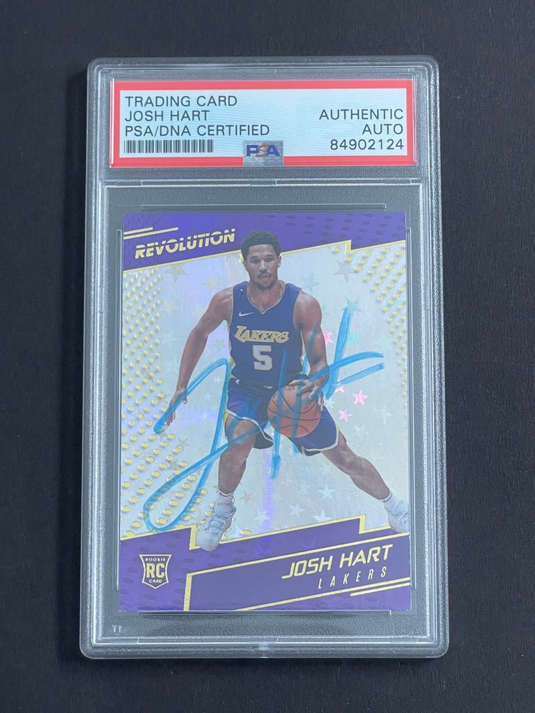 Up for sale is a 2017-18 Panini Revolution #132 card signed by JOSH HART who notably played for the Los Angeles Lakers. The autograph of Josh on this card was authenticated by a team of experts at PSA/DNA Authentication Services (PSA/DNA) and encapsulated so you can rest assured you are purchasing the real deal.