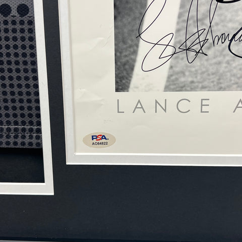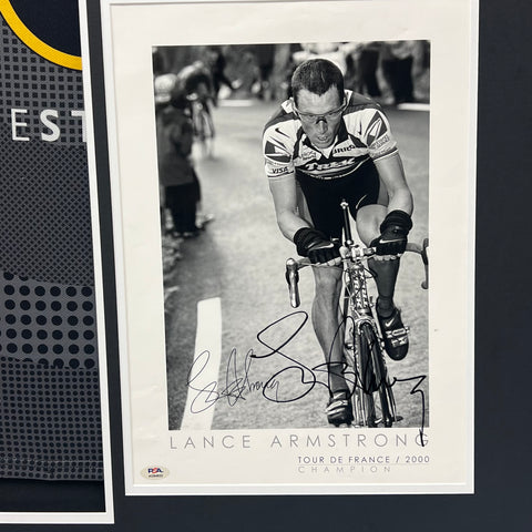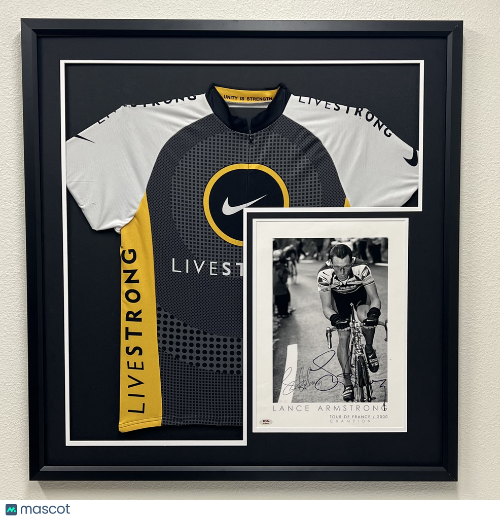 Thank you for checking out our store! We value each and every customer and want you to be happy with the purchase you are making. Up for sale is a custom jersey display frame with a poster signed by Lance Armstrong. The autograph of Lance on this Poster has been authenticated by the experts at PSA so you can rest assurred you are purchasing the real deal. We’d like to encourage you, our customer, to reach out to us if you come across any questions. We always take the time to respond to a message from our customers and we’re Listed With Mascot.