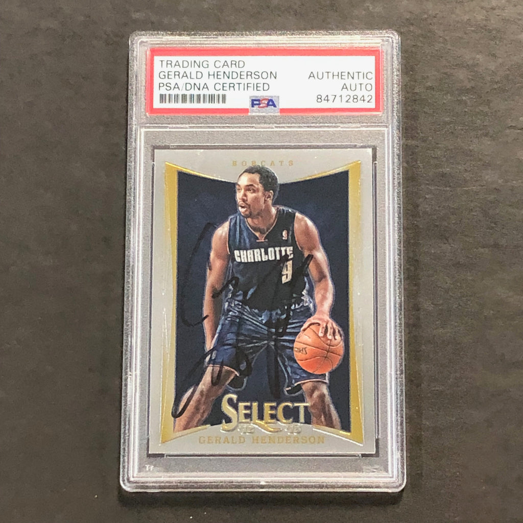 Up for sale is a 2012-13 Panini Select #18 card signed by Gerald Henderson who notably played for the Charlotte Bobcats. The autograph of Gerald on this card was authenticated by a team of experts at PSA/DNA Authentication Services (PSA/DNA) and encapsulated so you can rest assured you are purchasing the real deal.