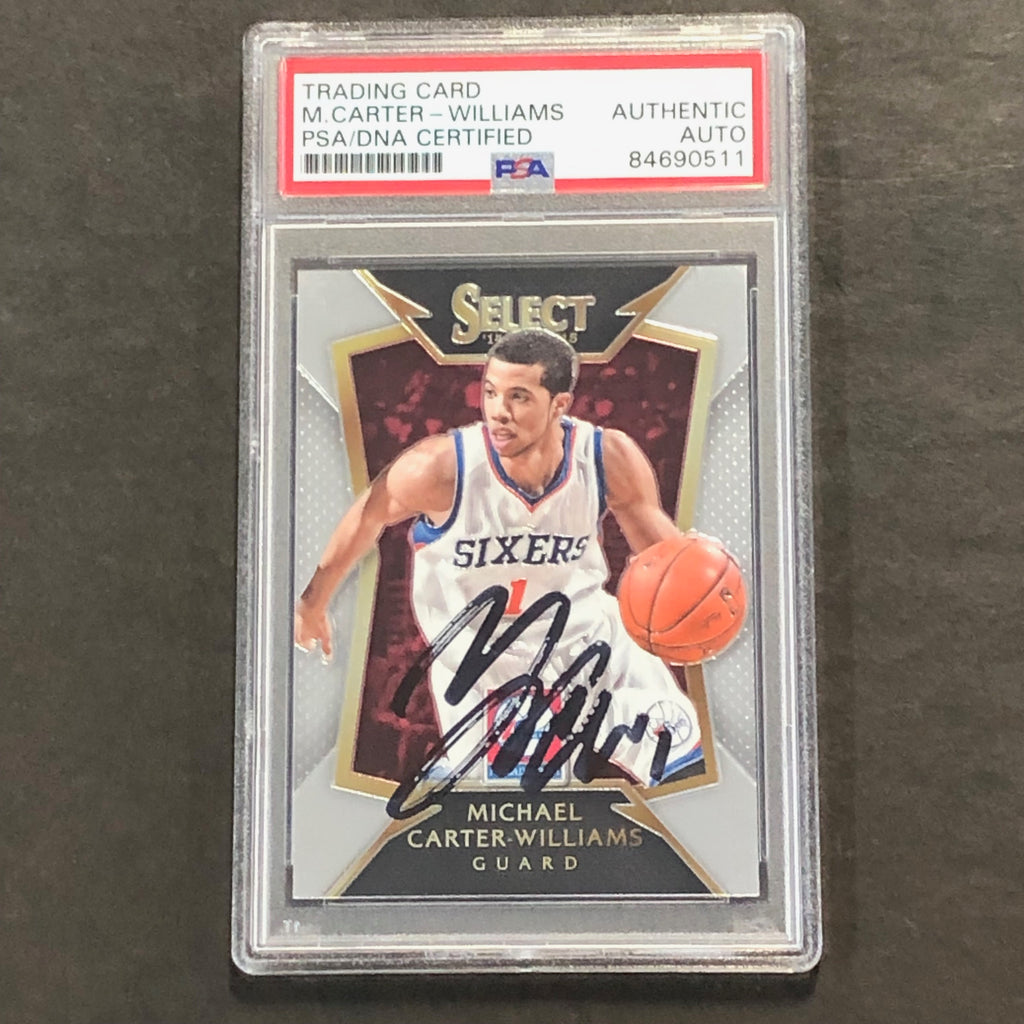 Up for sale is a 2014-15 Panini Select #48 card signed by Michael Carter-Williams who notably played for the Philadelphia 76ers. The autograph of Michael on this card was authenticated by a team of experts at PSA/DNA Authentication Services (PSA/DNA) and encapsulated so you can rest assured you are purchasing the real deal.
