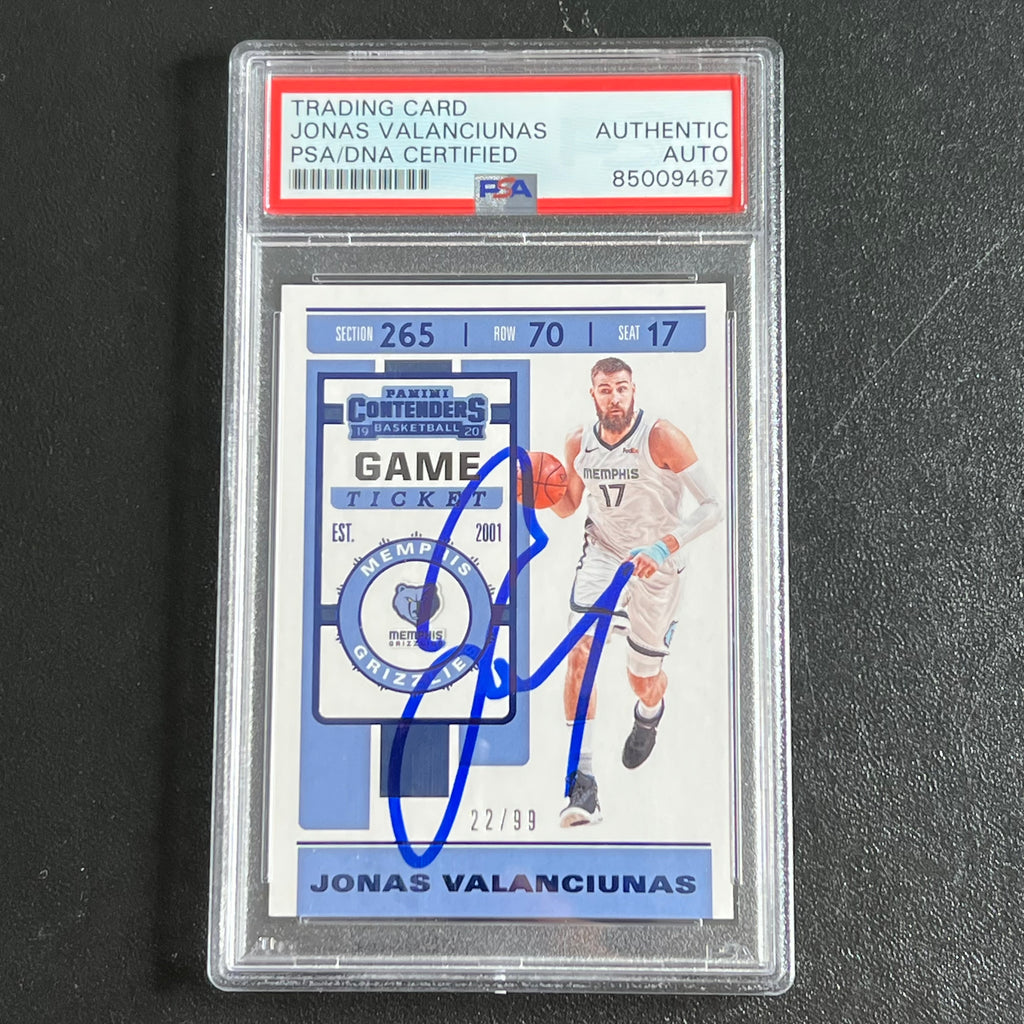 Up for sale is a 2019-20 Panini Contenders #48 signed by Jonas Valanciunas. The autograph of Jonas on this card was authenticated by a team of experts at PSA/DNA Authentication Services (PSA/DNA) and encapsulated so you can rest assured you are purchasing the real deal.
