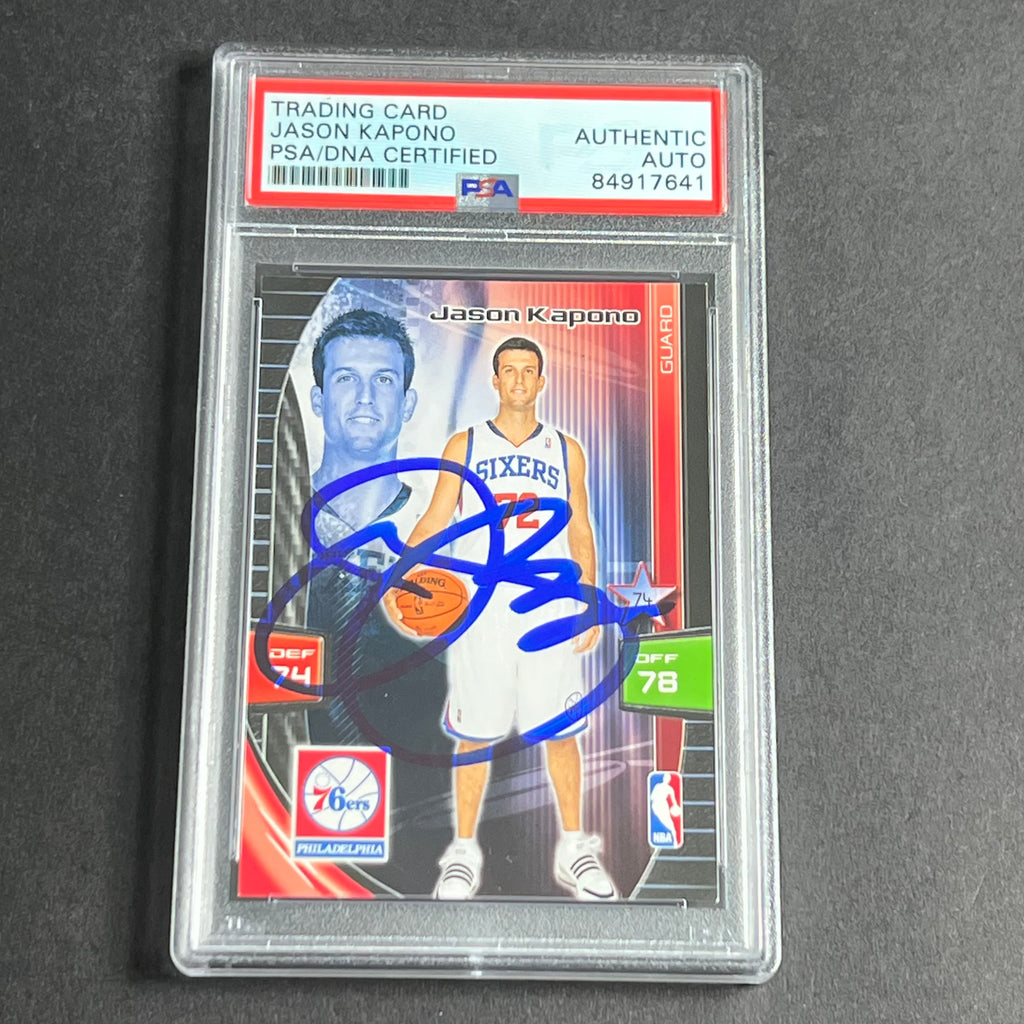 Up for sale is a 2009-10 Panini Adrenalyn card signed by Jason Kapono, who notably played for the Philadelphia 76ers. The autograph of Jason on this card was authenticated by a team of experts at PSA/DNA Authentication Services (PSA/DNA) and encapsulated so you can rest assured you are purchasing the real deal.