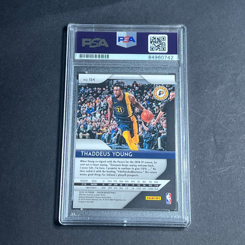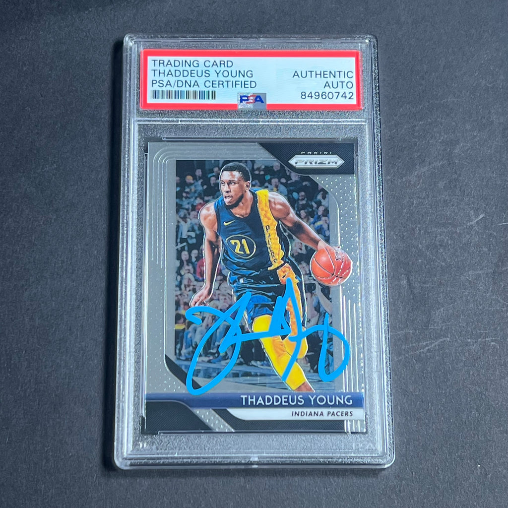 Up for sale is a 2018-19 Panini Prizm #154 card signed by Thaddeus Young who notably played for the Indiana Pacers. The autograph of Thaddeus on this card was authenticated by a team of experts at PSA/DNA Authentication Services (PSA/DNA) and encapsulated so you can rest assured you are purchasing the real deal.