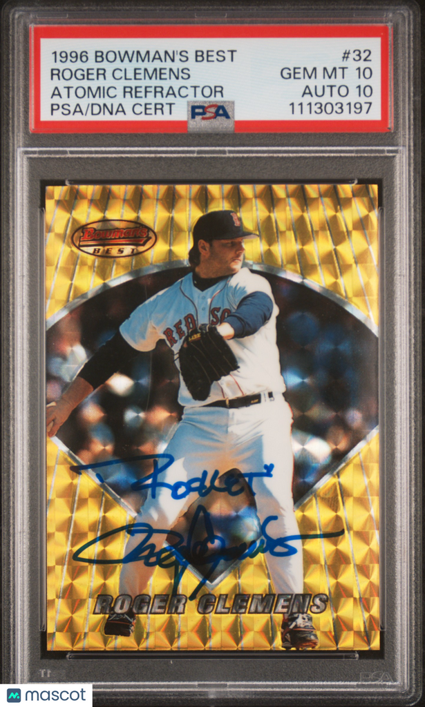 Thank you for checking out our store! We value each and every customer and want you to be happy with the purchase you are making. You are purchasing a 1996 Bowman's Best #32 Roger Clemens PSA 10 Auto 10 . We’d like to encourage you, our customer, to reach out to us if you come across any questions. We always take the time to respond to a message from our customers and we’re happy to hear from you! Listed With Mascot.