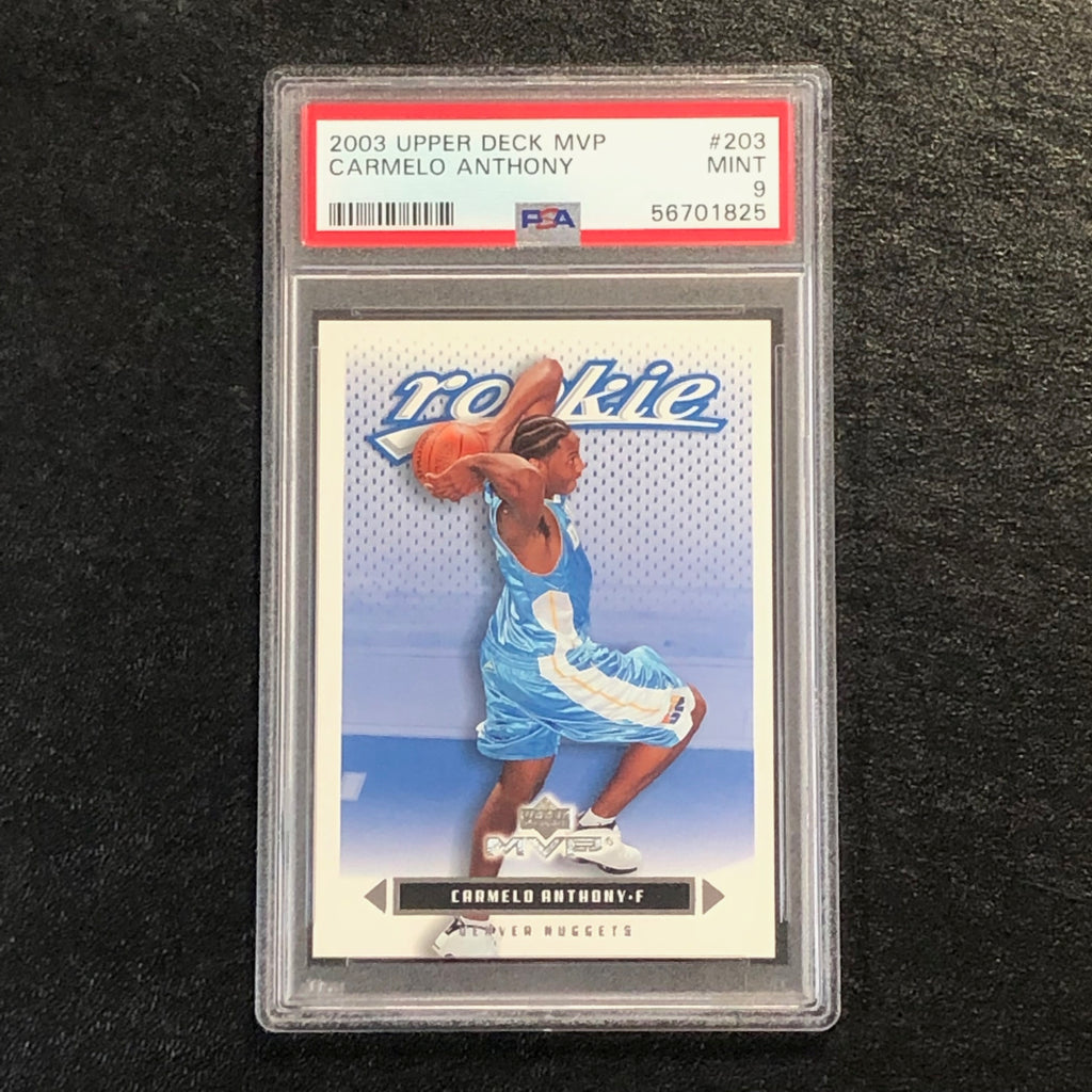 Up for sale is a 2003 Upper Deck MVP #203 Carmelo Anthony PSA 9 Mint RC Nuggets. This card has been professionally graded a 10 by PSA, forever solidifying its condition so you can buy with confidence.