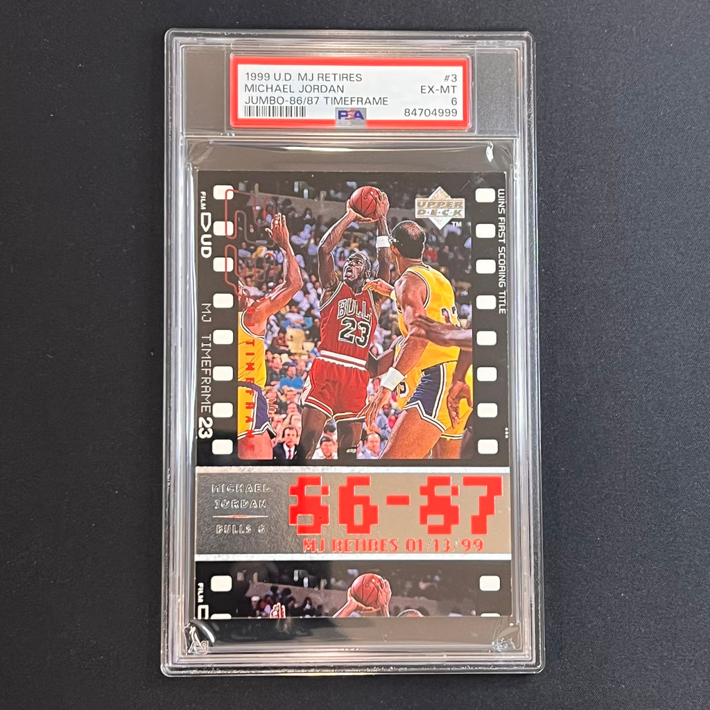Up for sale is a 1999 Upper Deck MJ Retires Jumbo-86/87 Timeframe #3 card graded PSA EX MT 6. This card has been professionally graded by PSA, forever solidifying its condition so you can buy with confidence.