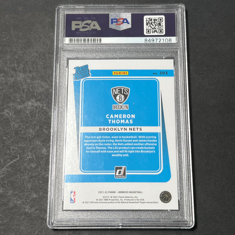 Up for sale is a 2021-22 Panini Donruss Rated Rookie Hoops #203 signed by Cameron Thomas. The autograph of Cameron on this card was authenticated by a team of experts at PSA/DNA Authentication Services (PSA/DNA) and encapsulated so you can rest assured you are purchasing the real deal.