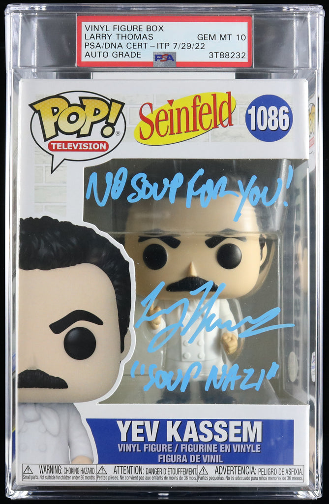Up for sale is a "Yev Kassem" Funko Pop signed by Larry Thomas from the hit show Seinfeld where he played the character commonly known as the "Soup Nazi". He also inscribed a quote from the show "No Soup For You!". The autograph of Larry on this Funko was authenticated by a team of experts at PSA/DNA so you can rest assured you are purchasing the real deal.